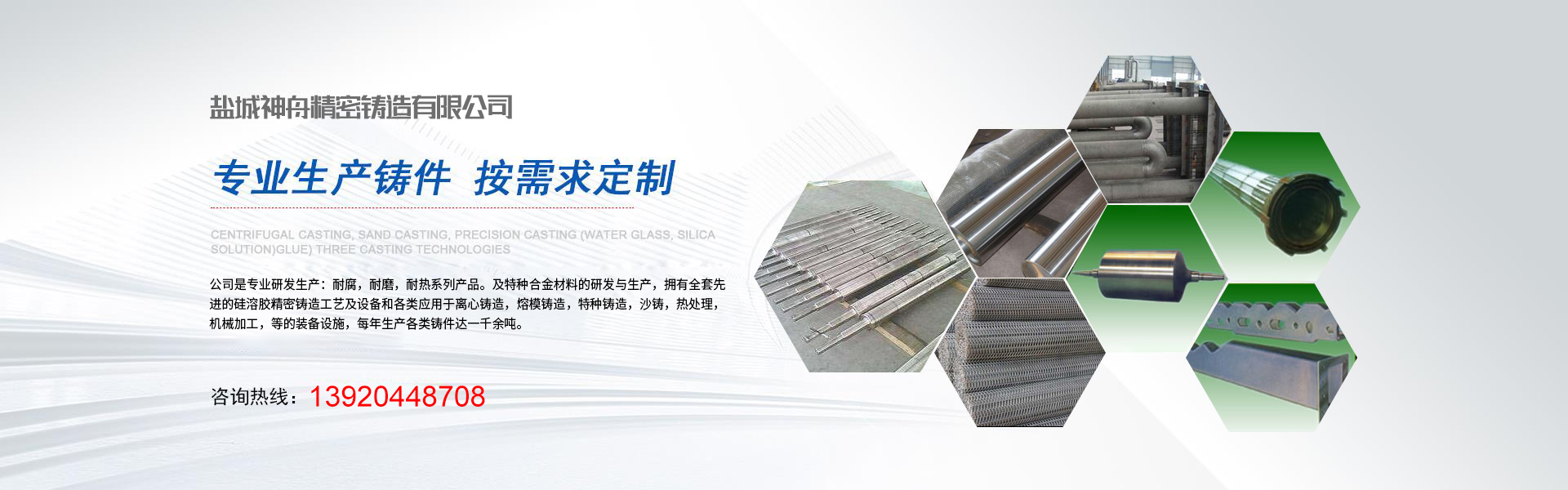 、耐腐,耐磨,耐熱糸列產(chǎn)品。及特種合金材料的研發(fā)與生產(chǎn),擁有全套先進(jìn)的硅溶膠精密鑄造工藝及設(shè)備和各類(lèi)應(yīng)用于離心鑄造,熔模鑄造,特種鑄造,沙鑄,熱處理,機(jī)械加工,等的裝備設(shè)施,每年生產(chǎn)各類(lèi)鑄件達(dá)一千余噸。